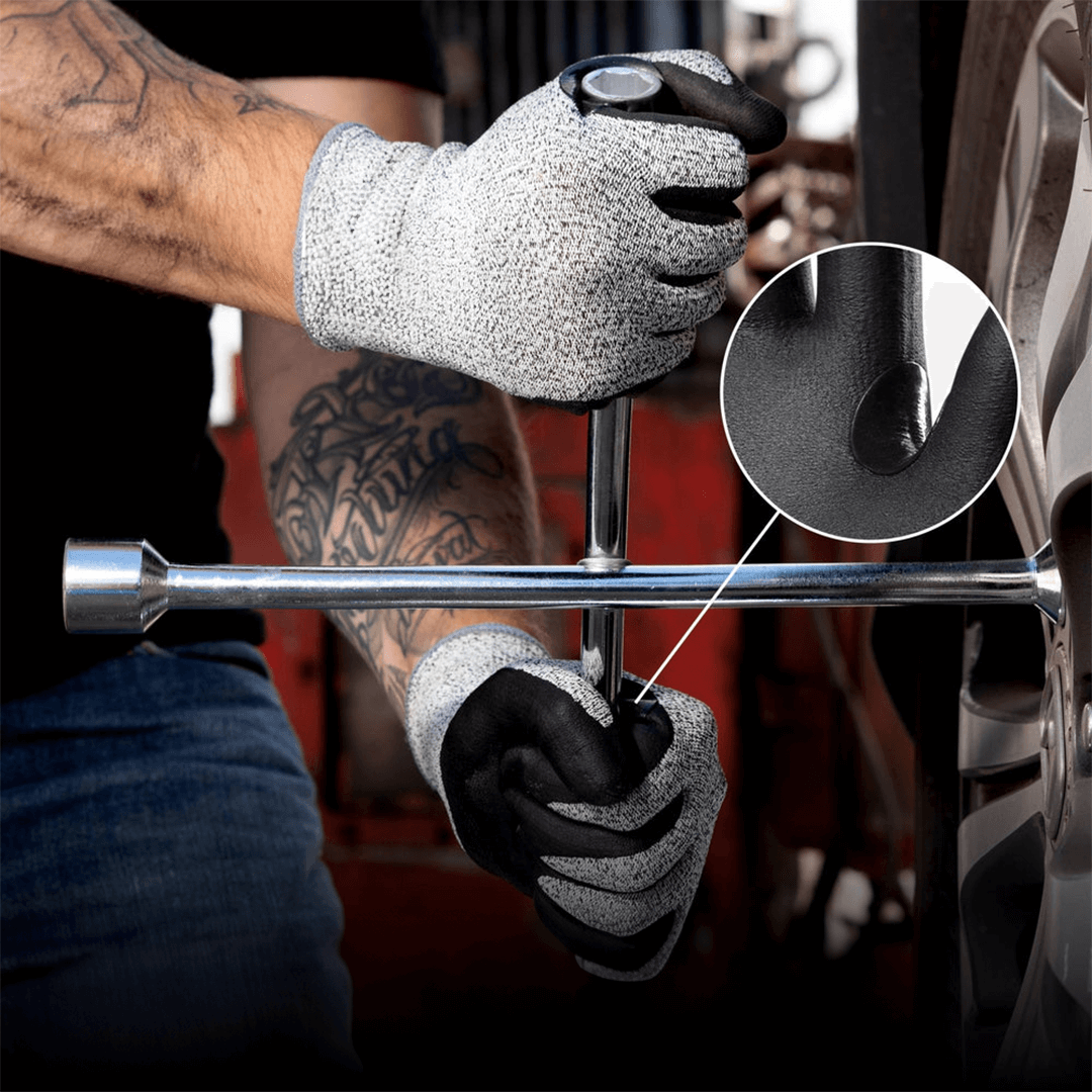 Gefertigt aus schnittfestem Material, bietet der Handschutz hohe Widerstandsfähigkeit. Verstärkte Handflächen und Fingerspitzen sorgen für zusätzlichen Schutz, während das atmungsaktive Material Komfort gewährleistet – ob in der Werkstatt oder in der Küche.
