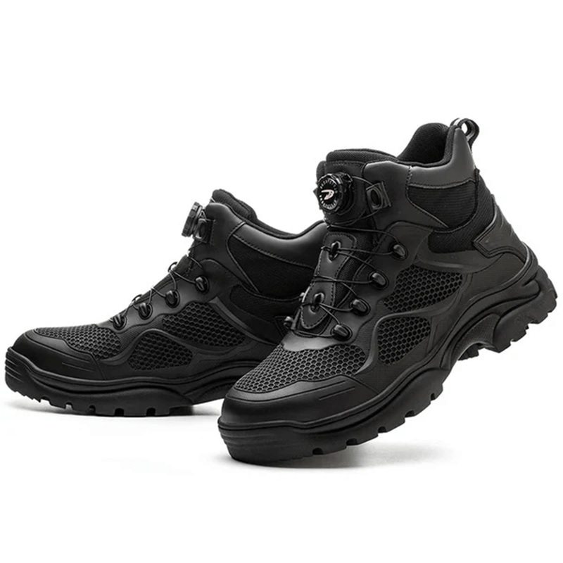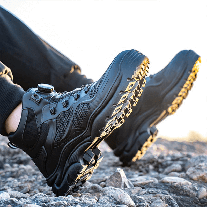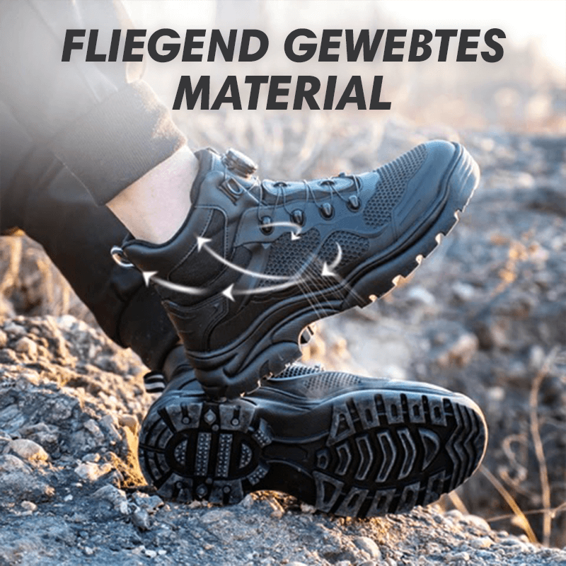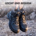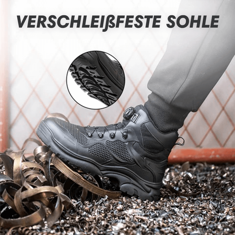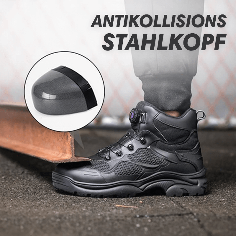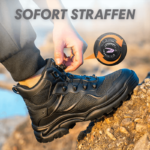 Die Tobias Sicherheitsschuhe kommen mit einem modernen schnürlosen Verschlusssystem, das einfach zu bedienen und langlebig ist. Durch einen Drehmechanismus lässt sich der Schuh schnell und sicher anpassen, was Zeit spart und zusätzlichen Komfort bietet. Kein lästiges Nachschnüren mehr während der Arbeit.