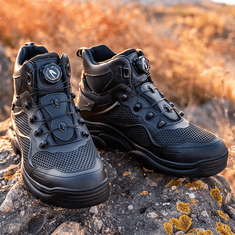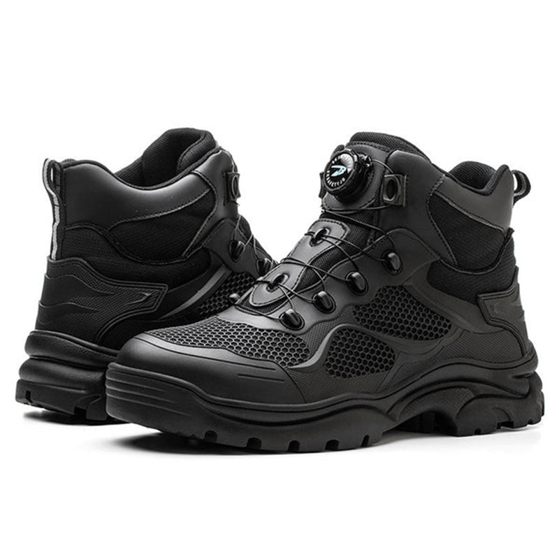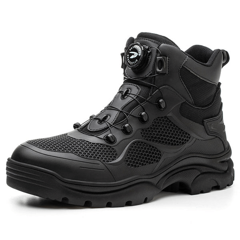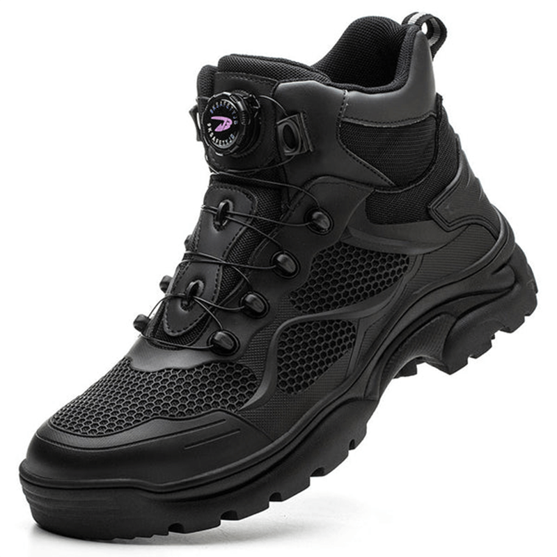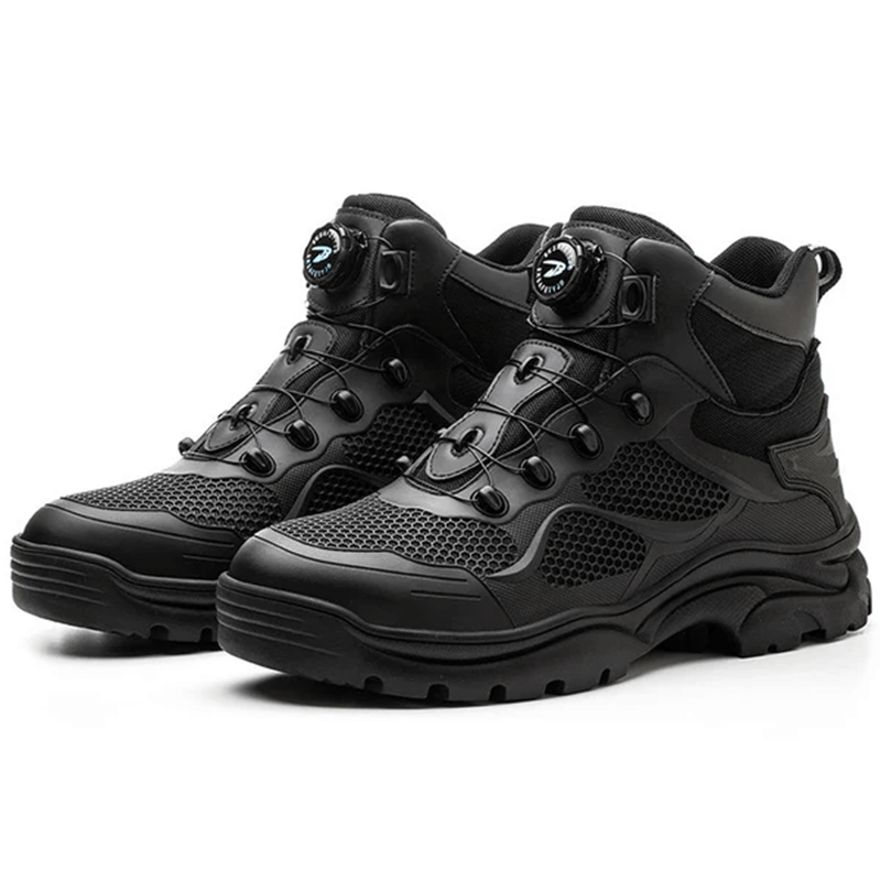 Die Tobias Sicherheitsschuhe kommen mit einem modernen schnürlosen Verschlusssystem, das einfach zu bedienen und langlebig ist. Durch einen Drehmechanismus lässt sich der Schuh schnell und sicher anpassen, was Zeit spart und zusätzlichen Komfort bietet. Kein lästiges Nachschnüren mehr während der Arbeit.